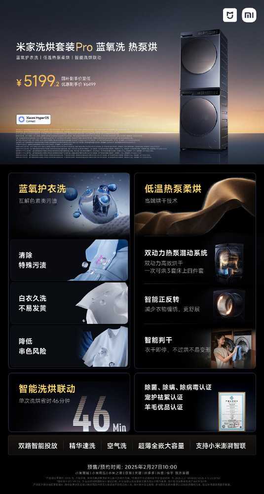 米家洗烘套装Pro蓝氧洗热泵烘原价6499元,国补后到手价5199.2元。拥有双路智能投放、精华速洗、空气洗、超薄全嵌大容量等优点。采用蓝氧洗技术,高效去渍,久洗不发黄,混洗防串色,搭载高端热泵烘干技术,做到大件烘得透、平整少褶皱、不过烘、不伤衣。支持洗烘联动,省时46分钟,全年省电196度,还有3D水流除毛洗和四层净滤烘功能。
