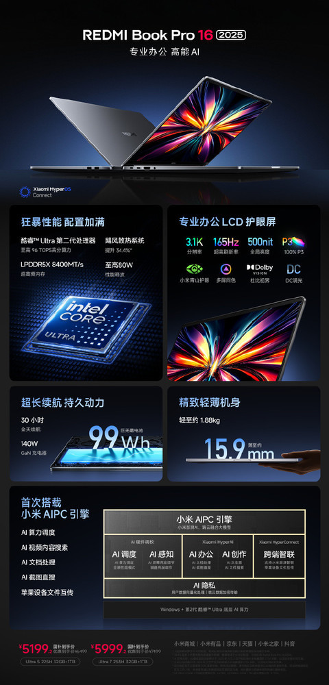 第二款发布的产品是REDMIBookPro162025,国补到手价5199元起,性价比出众。