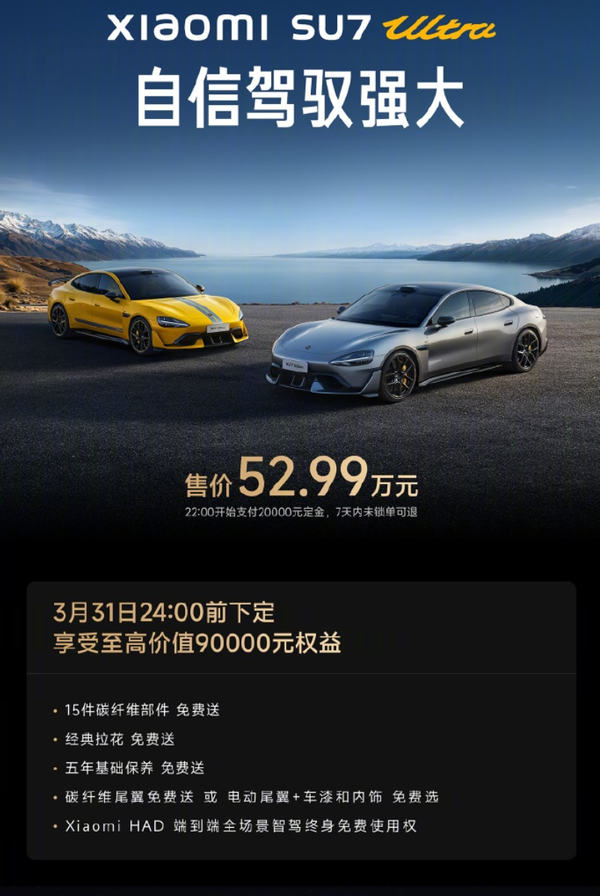 作为小米SU7的高性能车型,小米SU7Ultra装备有更运动的车身套件,搭载两台V8s电机以及一台V6s电机,系统综合最大功率为1548马力,0-100公里/小时加速时间为1.98秒,最高车速350公里/小时。在3月31日前下定,可享价值9万元权益免费送。
