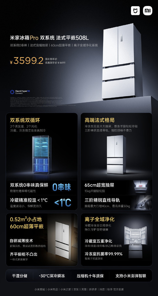 米家冰箱Pro双系统法式平嵌508L首发价4499元,国补后到手3599.2元。采用65cm宽幅抽屉设计,单抽屉承重50kg,配备冷藏冷冻双循环系统,实现独立控温,有效减少串味问题。